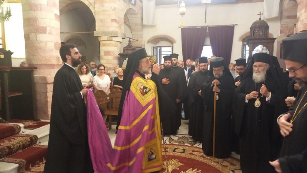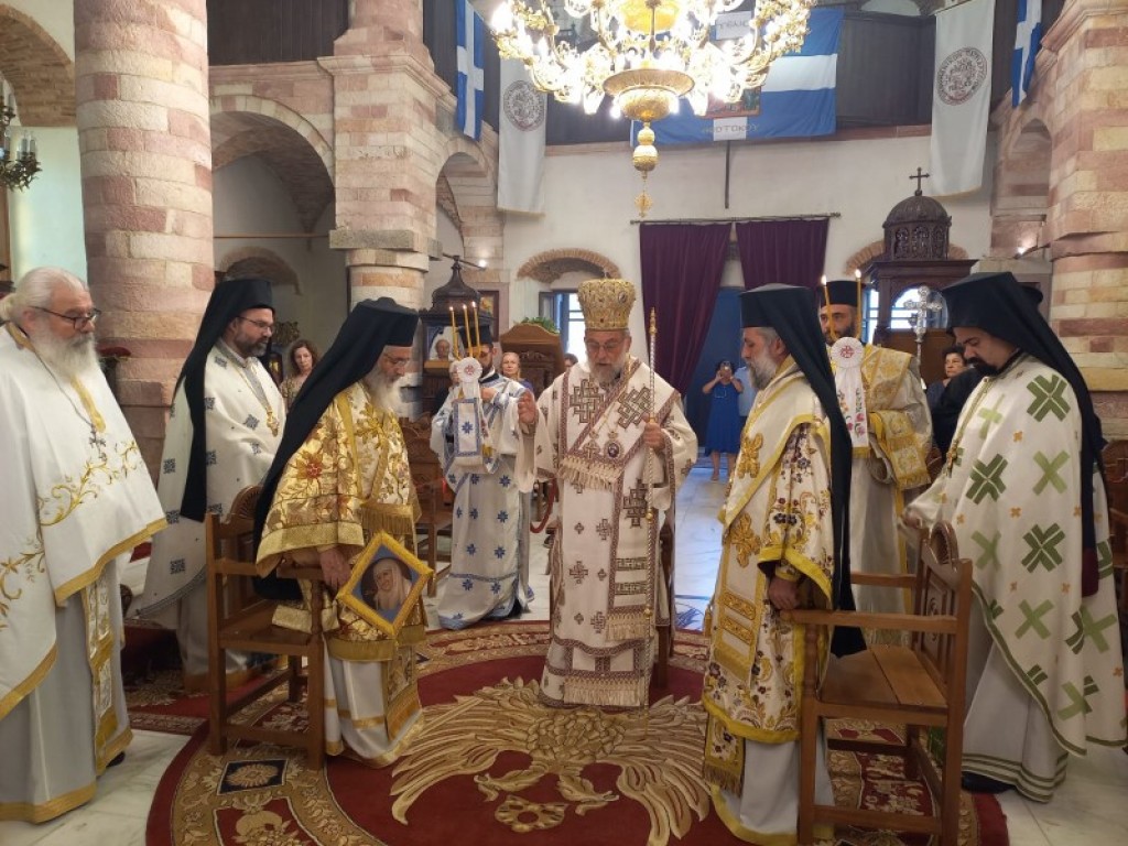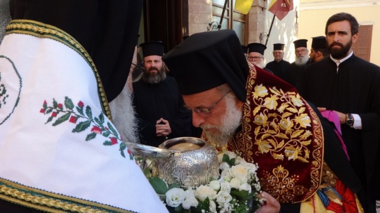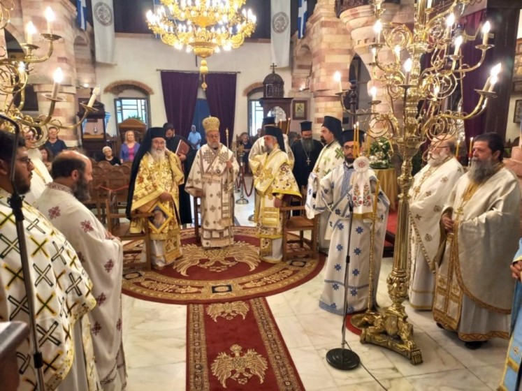 Την κυριώνυμη ημέρα της Μνήμης της Οσίας (Πέμπτη 18 Ιουλίου) ο Σεβασμιώτατος προέστη της τρισαρχιερατικής Θείας Λειτουργίας, συλλειτουργούντων του οικείου Ποιμενάρχου και του αγίου Στρατονικείας. Πρίν την απόλυση της Θείας Λειτουργίας ο Σεβασμιώτατος ευχαρίστησε τον Σεβασμιώτατο άγιο Λέρου για την προσγενομένη πρόσκληση να παραστεί στην πανήγυρη και μετέφερε τα συγχαρητήρια και τις ευχές της Αυτού Θειοτάτης Παναγιότητος, εκείνος δε ενεχείρισε στον Σεβασμιώτατο απότμημα Ιερού Λειψάνου της Οσίας προς ευλογία του ποιμνίου της Ιεράς Μητροπόλεως Ρόδου καθώς και διάφορα αναμνηστικά δώρα. Επίσης, εις ανάμνησιν του πρώτου αυτού εορτασμού της Μνήμης της Οσίας, ενεχείρισε από μία μεγάλη Εικόνα της στον Σεβ. Μητροπολίτη Γουϊνέας κ. Γεώργιο, στην Καθηγουμένη της Ιεράς Μονής Παναγίας Υψενής Ρόδου Μοναχή Μαριάμ και στην Καθηγουμένη της Ιεράς Μονής Παναγίας των Βρυούλων Μοναχή Φιλοθέη. Μετά το πέρας της Θείας Λειτουργίας παρετέθη δεξίωση στην αίθουσα του Μητροπολιτικού ιερού Ναού.