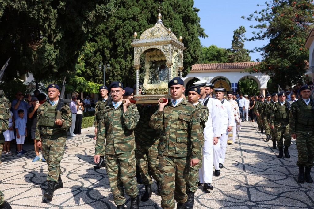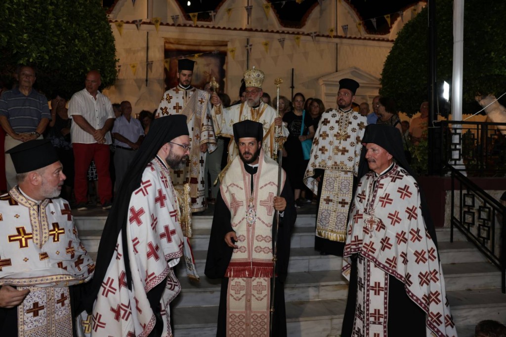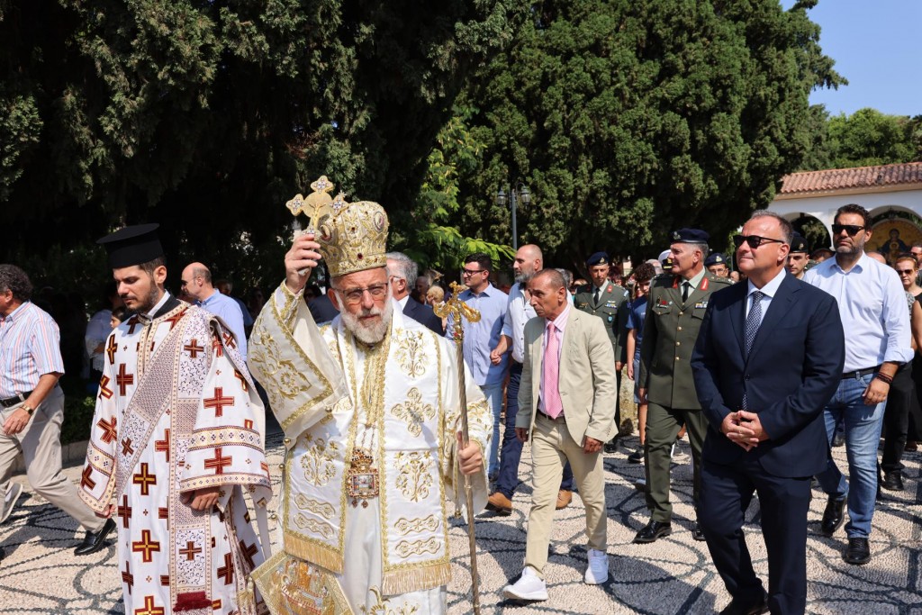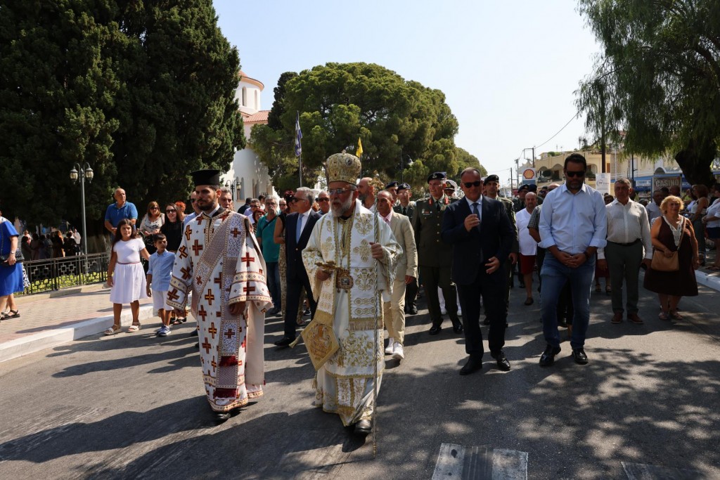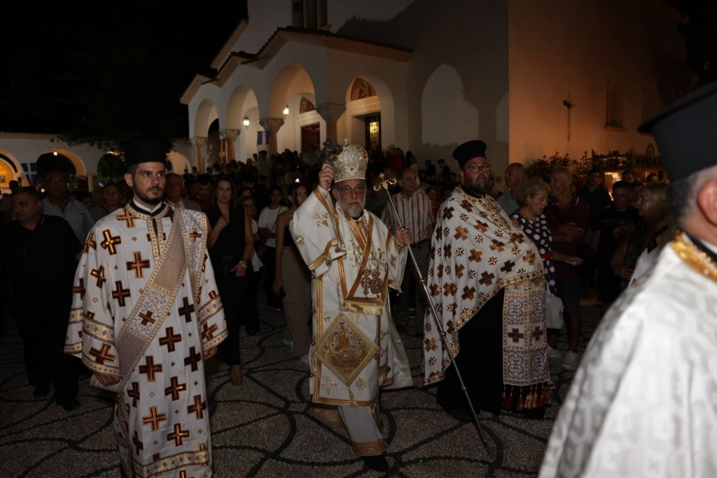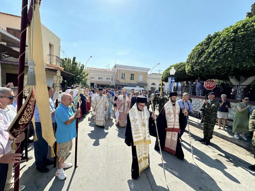Την κυριώνυμη ημέρα της Εορτής ο Σεβασμιώτατος Μητροπολίτης μας χοροστάτησε του Όρθρου και προέστη της τρισαρχιερατικής Θείας Λειτουργίας, συλλειτουργούντων του Σεβ. αγίου Νουβίας και του Θεοφιλ. αγίου Ολύμπου στον ιερό Ναό Κοιμήσεως Θεοτόκου Ιαλυσού. Μετά το πέρας της Θείας Λειτουργίας, έλαβε χώρα η μεγαλοπρεπής λιτανεία, την οποία ακολούθησε το σύνολο των τοπικών πολιτικών και στρατιωτικών Αρχών του Νησιού μας και πλήθος κόσμου.
