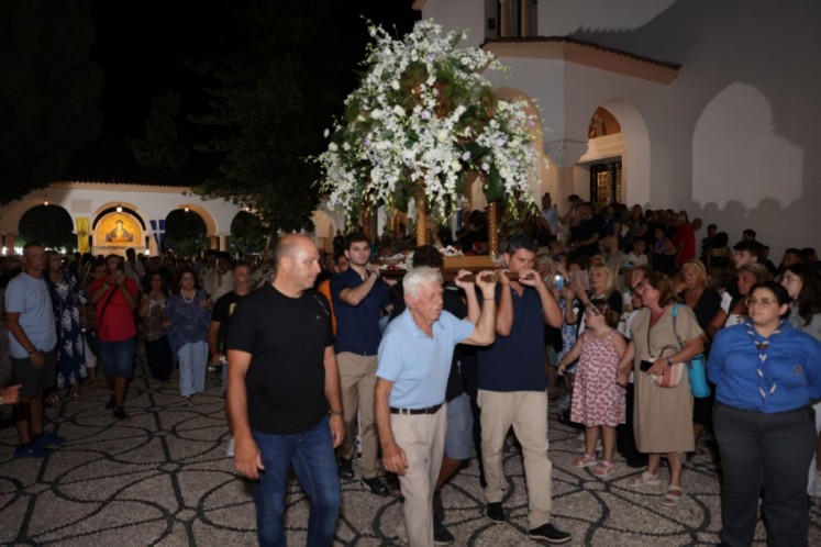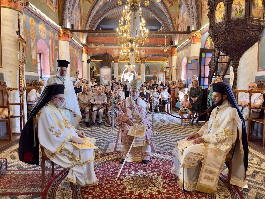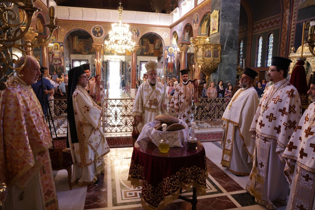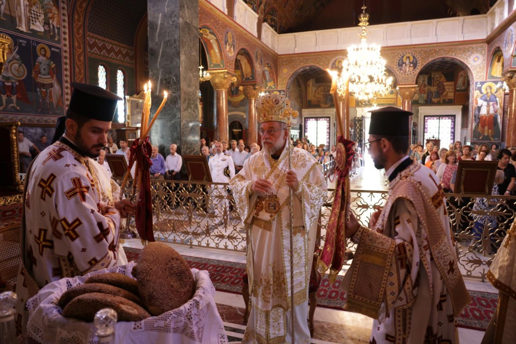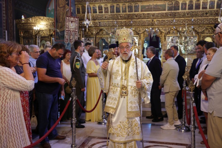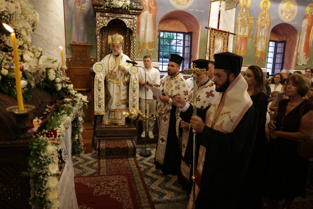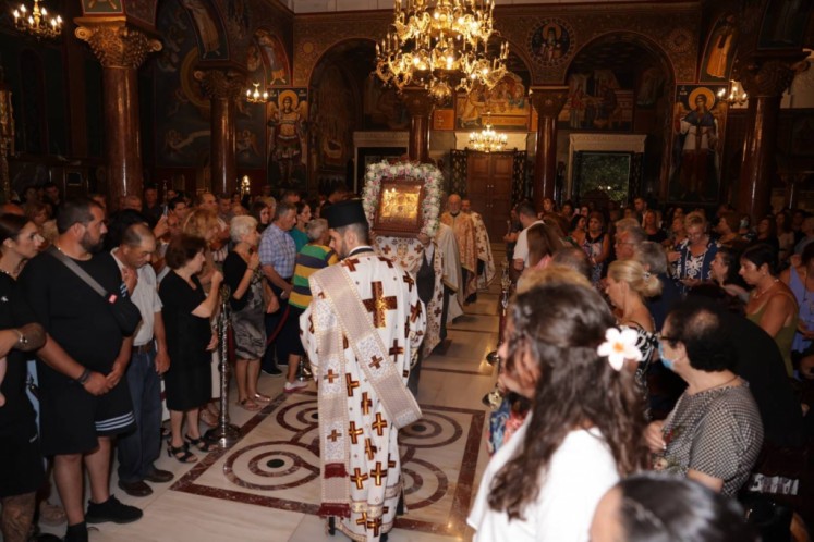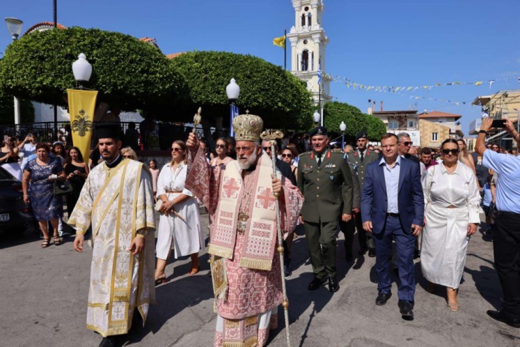 Την κυριώνυμη ημέρα της Εορτής ο Σεβασμιώτατος Μητροπολίτης μας χοροστάτησε του Όρθρου και προέστη της τρισαρχιερατικής Θείας Λειτουργίας, συλλειτουργούντων του Σεβ. αγίου Νουβίας και του Θεοφιλ. αγίου Ολύμπου στον ιερό Ναό Κοιμήσεως Θεοτόκου Ιαλυσού. Μετά το πέρας της Θείας Λειτουργίας, έλαβε χώρα η μεγαλοπρεπής λιτανεία, την οποία ακολούθησε το σύνολο των τοπικών πολιτικών και στρατιωτικών Αρχών του Νησιού μας και πλήθος κόσμου.