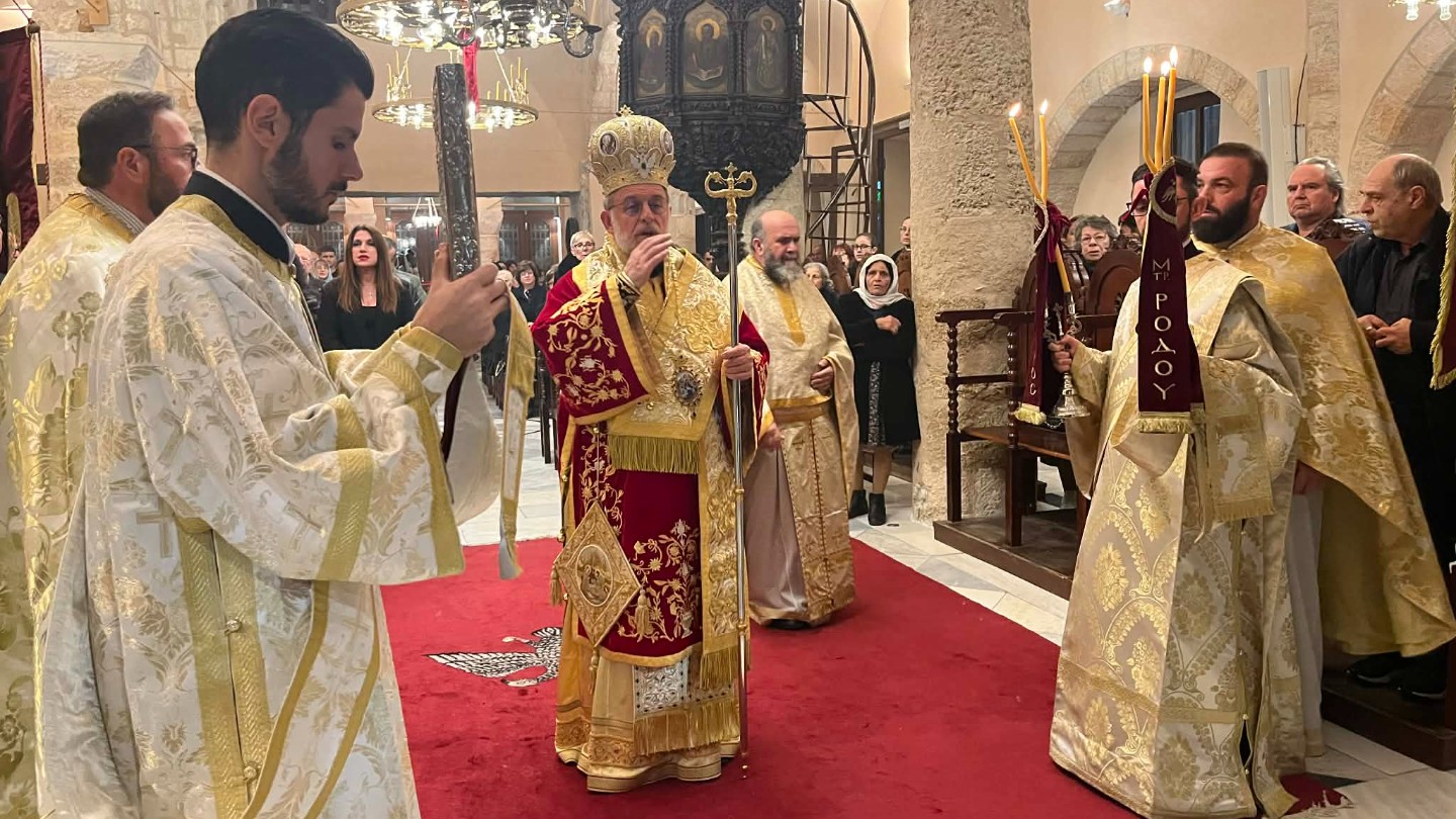 Εὐφραίνου ἐν Κυρίῳ, Βατοπαιδίου ἡ Μεγίστη Μονή, ὡς θησαυρὸν πολυτάλαντον τῆς χάριτος, τῆς Παντανάσσης Παρθένου, τὴν Εἰκόνα ἐν κόλποις κατέχουσα˙ ἀγάλλου δὲ εὐσεβῶς, καὶ ἡ ἐν Ῥόδῳ νεόδμητος Μάνδρα, τὸ ἱερὸν αὐτῆς ἀντίτυπον, ὡς πηγὴ ἁγιάσματος πλουτήσασα˙ ἀμφότεραι δὲ ὁμοῦ, τὰ μεγαλεῖα τῆς Θεοτόκου, ἐν καυχήσει διηγούμεναι, τῇ ἀπειράνδρῳ Μητρὶ τοῦ Θεοῦ, ὡς δι̉ ἑνὸς στόματος βοήσατε˙ Χαῖρε Κεχαριτωμένη, Θεοκυῆτορ Μαρία, ὁ Κύριος μετὰ σοῦ, ὁ παρέχων τῷ κόσμῳ, διὰ σοῦ τὸ μέγα ἔλεος.