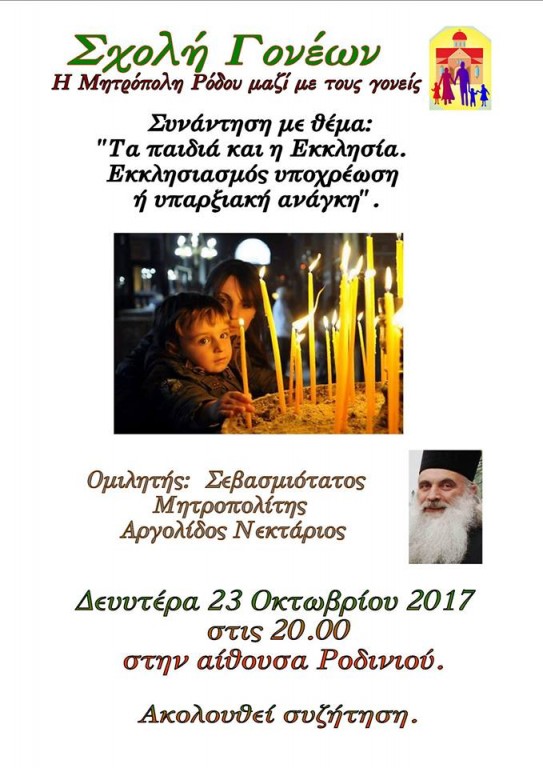 Η Σχολή Γονέων της Ιεράς Μητροπόλεως Ρόδου λειτουργεί ήδη από το 2012 και αποτελεί μία προσπάθεια της Μητρόπολής μας να συμπορευθεί μαζί με τους γονείς, καθώς και να προετοιμάσει τους υποψήφιους γονείς, για το δύσκολο αλλά και όμορφο έργο της ανάπτυξης και διαπαιδαγώγησης των παιδιών τους.