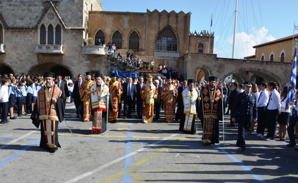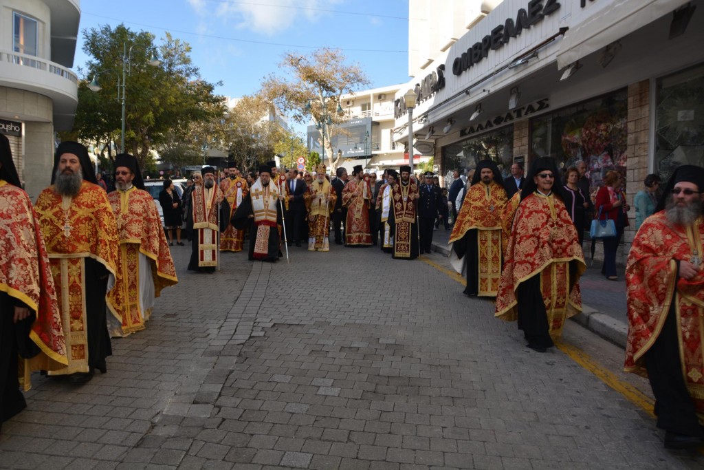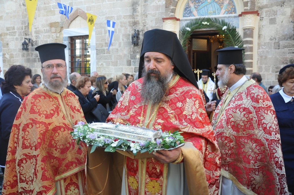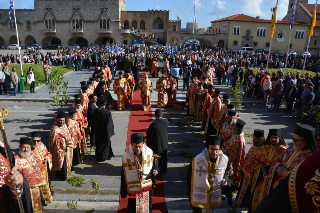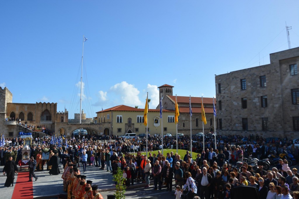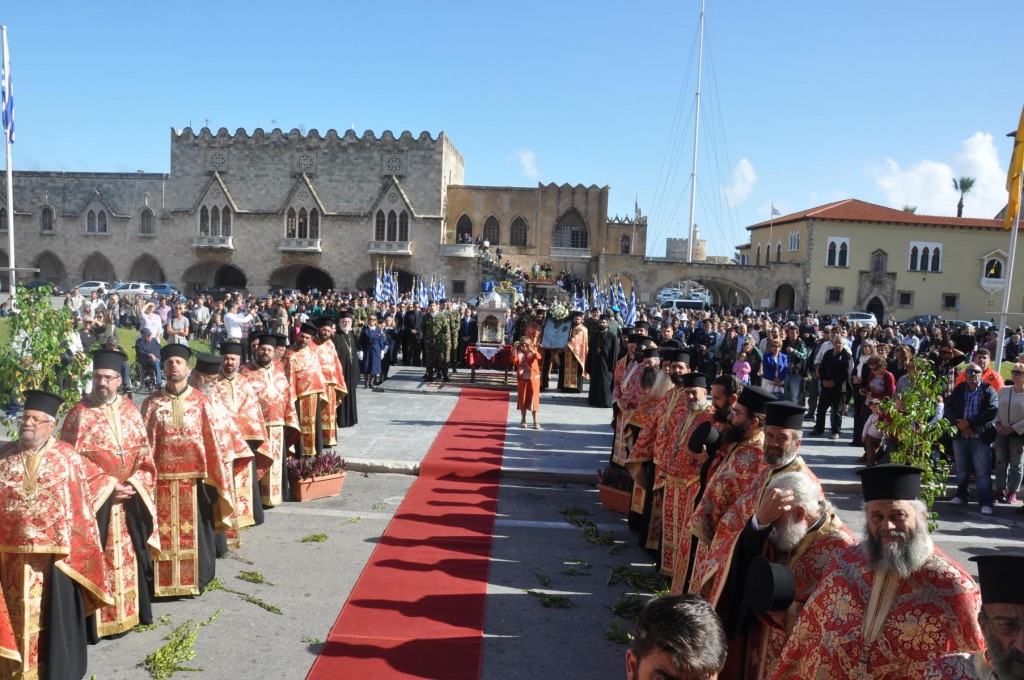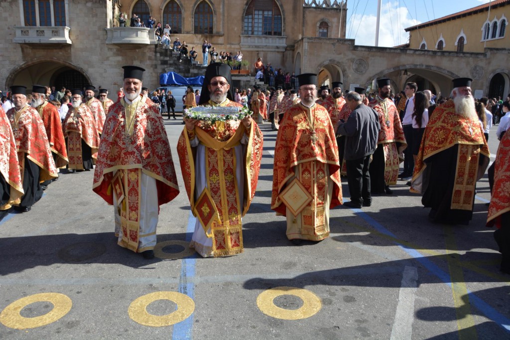 Το πρωί της Τετάρτης 14 Νοεμβρίου, κυριώνυμη ημέρα της μνήμης του Πολιούχου μας, τελέσθηκε, πολυαρχιερατικό Συλλείτουργο, προεξάρχοντος του Σεβασμιωτάτου ἁγίου Σύρου και συλλειτουργούντων των ως άνω Αρχιερέων. Μετά το πέρας της Θείας Λειτουργίας, πραγματοποιήθηκε πάνδημη λιτάνευση των ιερών Λειψάνων του Αγίου και, επί κιλλίβαντος, της ἐξ Ερμουπόλεως κομισθείσης ιεράς Εικόνας του, πλαισιούμενη από τη Φιλαρμονική του Δήμου Ρόδου, μαθητές όλων των Εκπαιδευτηρίων της πόλεως με τις σημαίες τους και άγημα Στρατού. Προ των πυλών του Δημαρχιακού Μεγάρου τελέσθηκε Αρτοκλασία και ανεπέμφθη Δέηση, με την ολοκλήρωση της οποίας ο Σεβασμιώτατος μας ευχαρίστησε τους Αρχιερείς και όλους τους παραστάντας στις εκδηλώσεις και ευχήθηκε ο Άγιος Κωνσταντίνος πάντοτε να μας δίνει δύναμη και χάρη ώστε να οδηγούμαστε στην αυτοσυνειδησία της πίστεως και των παραδόσεων του ευσεβούς Γένους μας και να συνεχίζουμε με υπομονή και αισιοδοξία τον καθημερινό μας αγώνα. Εν συνεχεία, στο Δημαρχιακό Μέγαρο, ο Δήμαρχος Ρόδου κ. Φώτης Χατζηδιάκος ευχαρίστησε με τη σειρά του τους Αρχιερείς, στους οποίους και προσέφερε κρυστάλλινο Σταυρό.