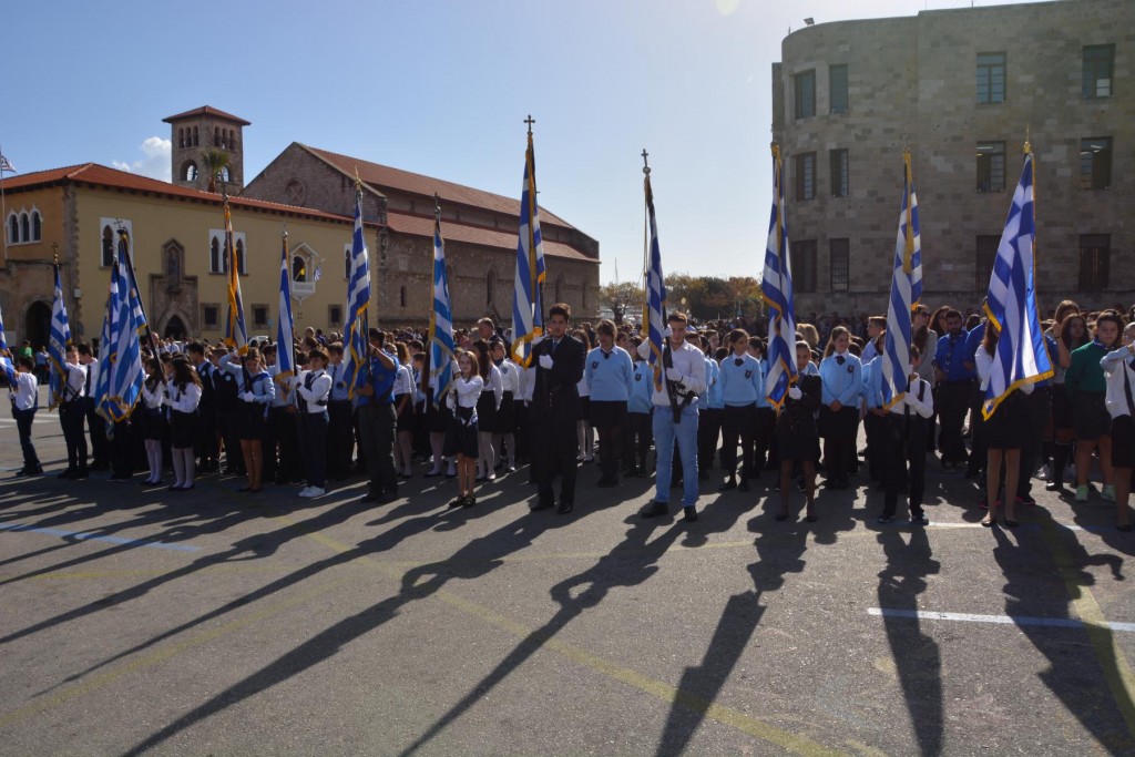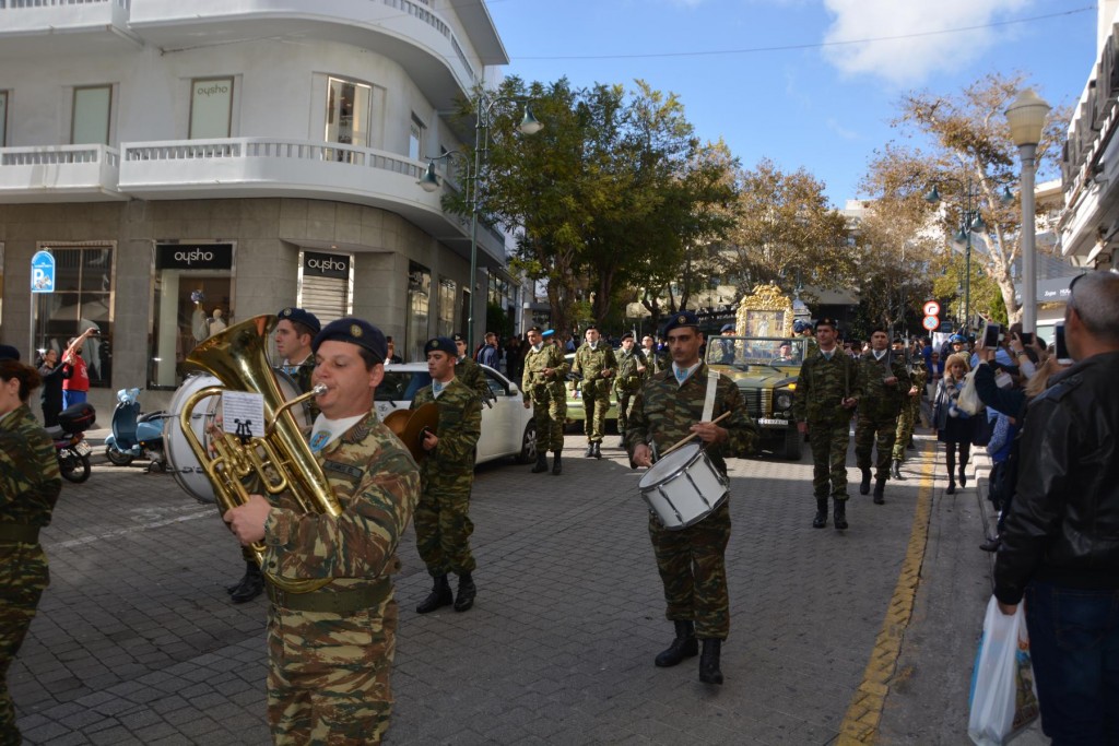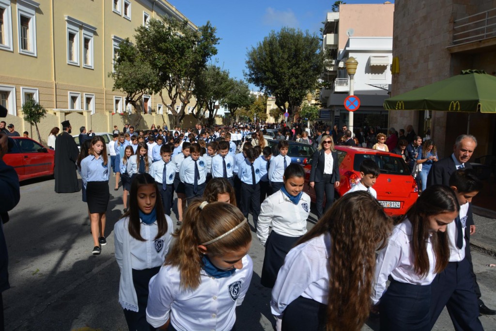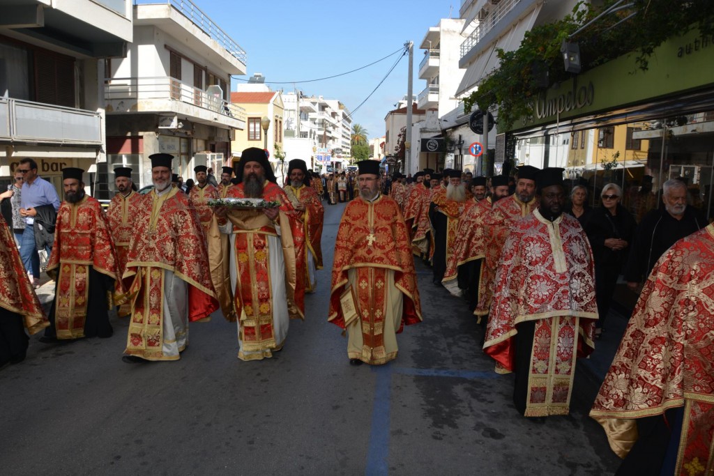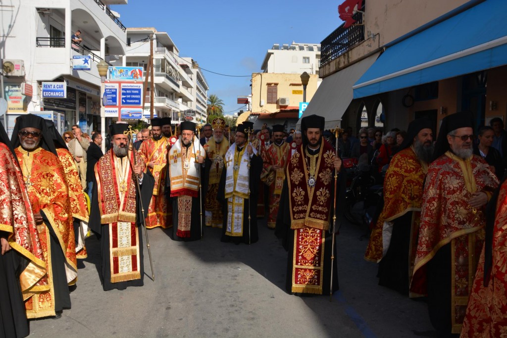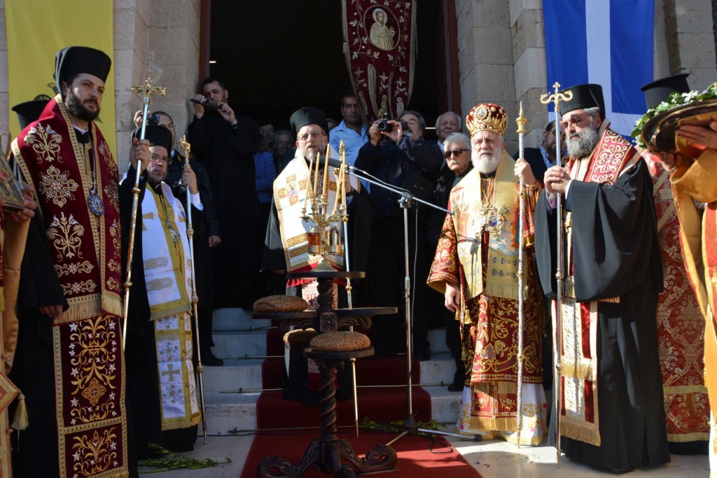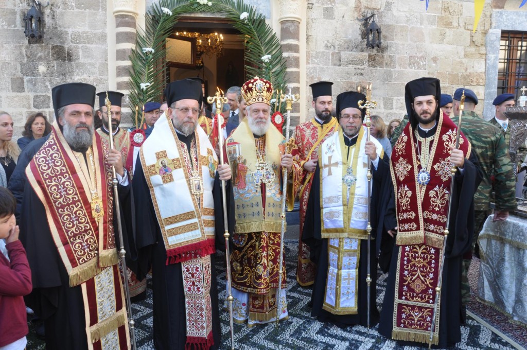 Το πρωί της Τετάρτης 14 Νοεμβρίου, κυριώνυμη ημέρα της μνήμης του Πολιούχου μας, τελέσθηκε, πολυαρχιερατικό Συλλείτουργο, προεξάρχοντος του Σεβασμιωτάτου ἁγίου Σύρου και συλλειτουργούντων των ως άνω Αρχιερέων. Μετά το πέρας της Θείας Λειτουργίας, πραγματοποιήθηκε πάνδημη λιτάνευση των ιερών Λειψάνων του Αγίου και, επί κιλλίβαντος, της ἐξ Ερμουπόλεως κομισθείσης ιεράς Εικόνας του, πλαισιούμενη από τη Φιλαρμονική του Δήμου Ρόδου, μαθητές όλων των Εκπαιδευτηρίων της πόλεως με τις σημαίες τους και άγημα Στρατού. Προ των πυλών του Δημαρχιακού Μεγάρου τελέσθηκε Αρτοκλασία και ανεπέμφθη Δέηση, με την ολοκλήρωση της οποίας ο Σεβασμιώτατος μας ευχαρίστησε τους Αρχιερείς και όλους τους παραστάντας στις εκδηλώσεις και ευχήθηκε ο Άγιος Κωνσταντίνος πάντοτε να μας δίνει δύναμη και χάρη ώστε να οδηγούμαστε στην αυτοσυνειδησία της πίστεως και των παραδόσεων του ευσεβούς Γένους μας και να συνεχίζουμε με υπομονή και αισιοδοξία τον καθημερινό μας αγώνα. Εν συνεχεία, στο Δημαρχιακό Μέγαρο, ο Δήμαρχος Ρόδου κ. Φώτης Χατζηδιάκος ευχαρίστησε με τη σειρά του τους Αρχιερείς, στους οποίους και προσέφερε κρυστάλλινο Σταυρό.