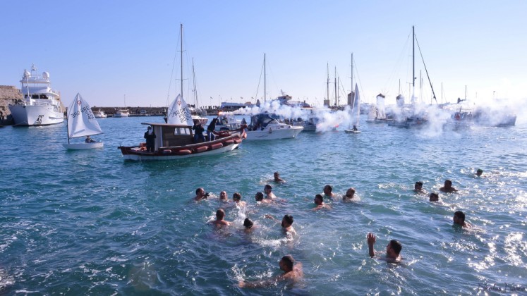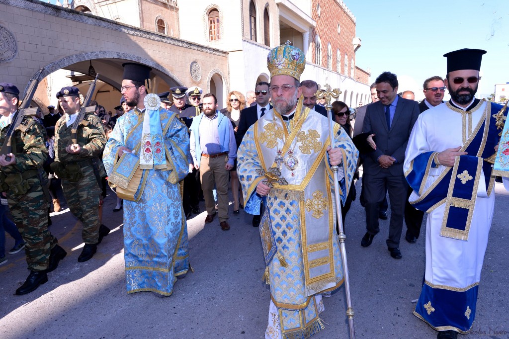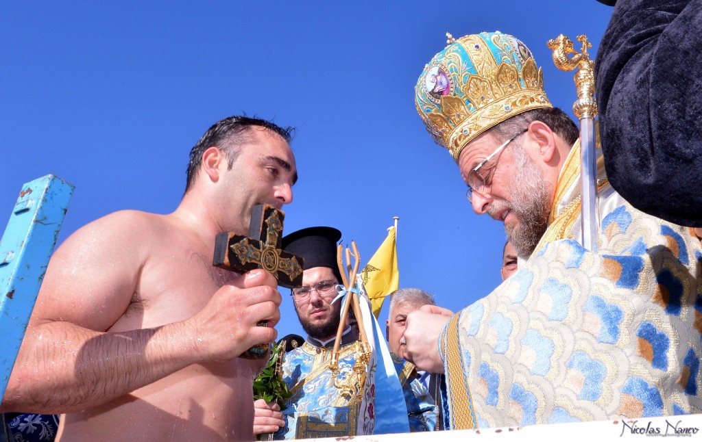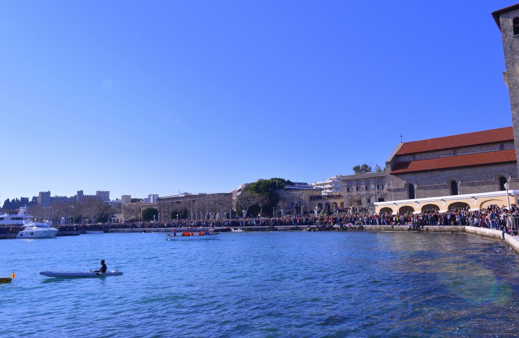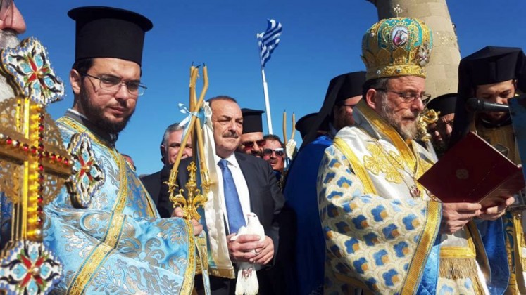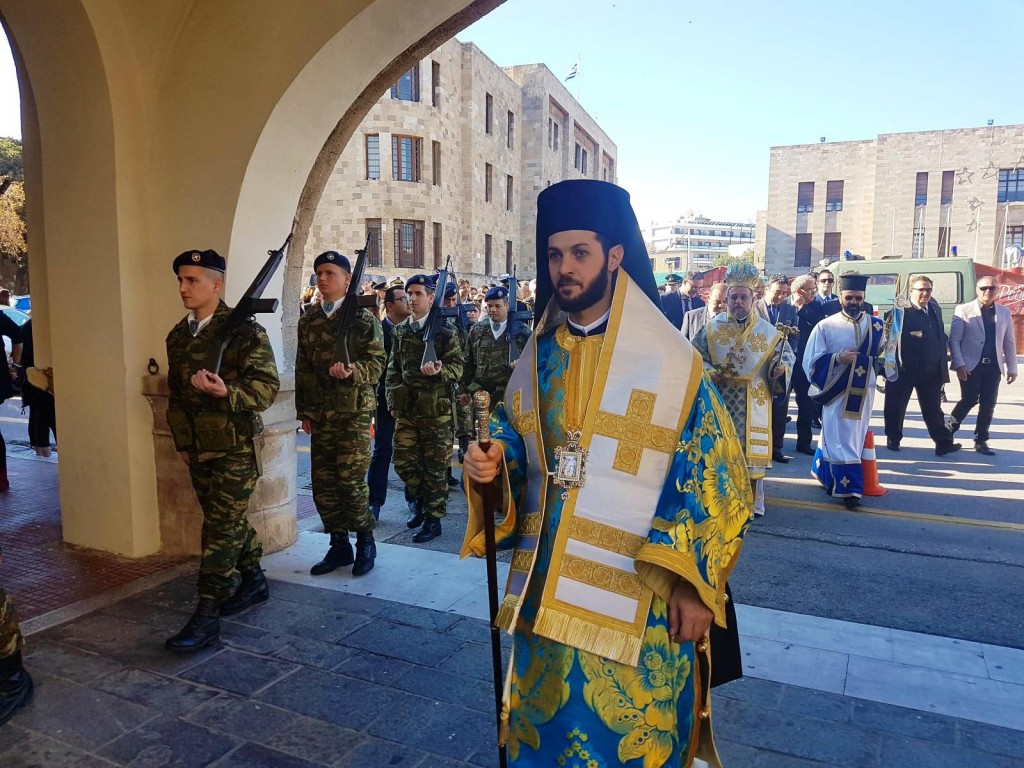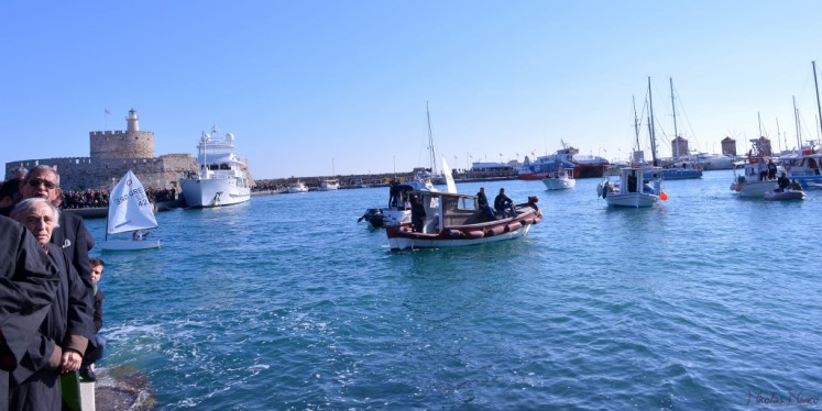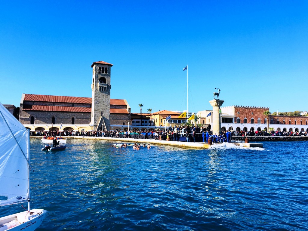 Την κυριώνυμη ημέρα της εορτής (6-1-2018) ο Σεβασμιώτατος εχοροστάτησε του Όρθρου, ετέλεσε την Θεία Λειτουργία (συλλειτουργούντος του Θεοφιλεστάτου αγίου Ολύμπου) και την Ακολουθία του Μεγάλου Αγιασμού των Θεοφανείων στον Καθεδρικό Ιερό Ναό του Ευαγγελισμού της Θεοτόκου και αμέσως μετά με τον ιερό Κλήρο, τους εκπροσώπους των τοπικών πολιτικών και στρατιωτικών Αρχών μετέβη στον καθορισμένο τόπο, στό λιμάνι του Μανδρακίου, όπου έλαβε χώρα η τελετή της καταδύσεως του Τιμίου Σταυρού και του Αγιασμού των υδάτων. Τον Σταυρό ανέσυρε από τα παγωμένα νερά o κ. Σωτήριος Δημόπουλος , στον οποίο ο Σεβασμιώτατος επέδωσε, κατά το έθος, χρυσό Σταυρό. Στη σύντομη προσλαλιά του αναφέρθηκε στο μήνυμα της Εορτής και ευχήθηκε τα δέοντα. Στη συνέχεια μετέβη στις εγκαταστάσεις του Ναυτικού Ομίλου Ρόδου για την καθιερωμένη ευλογία της Βασιλόπιτας του Ομίλου.
