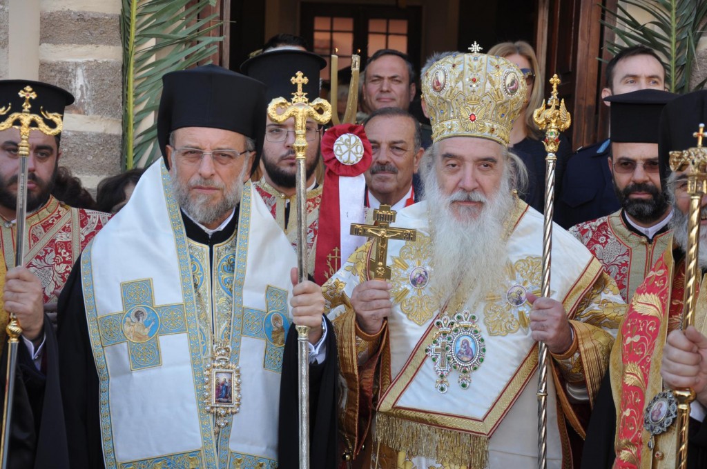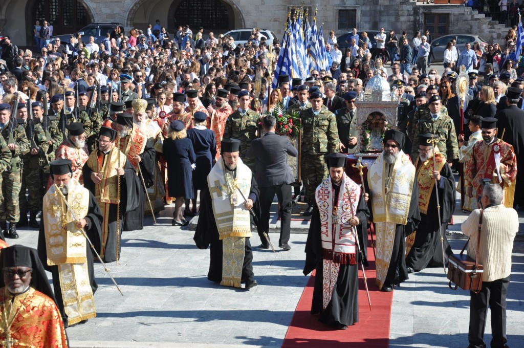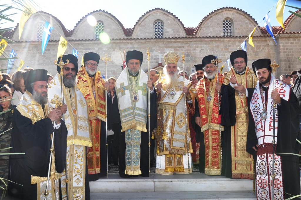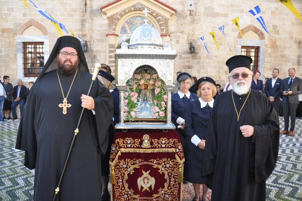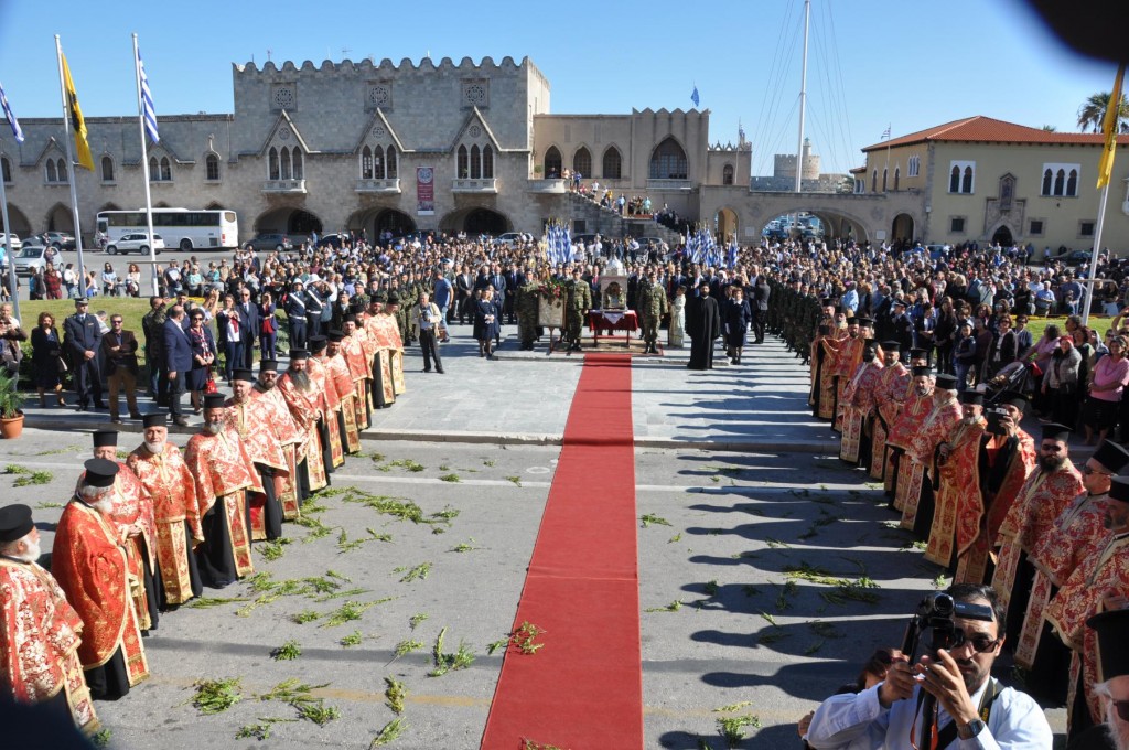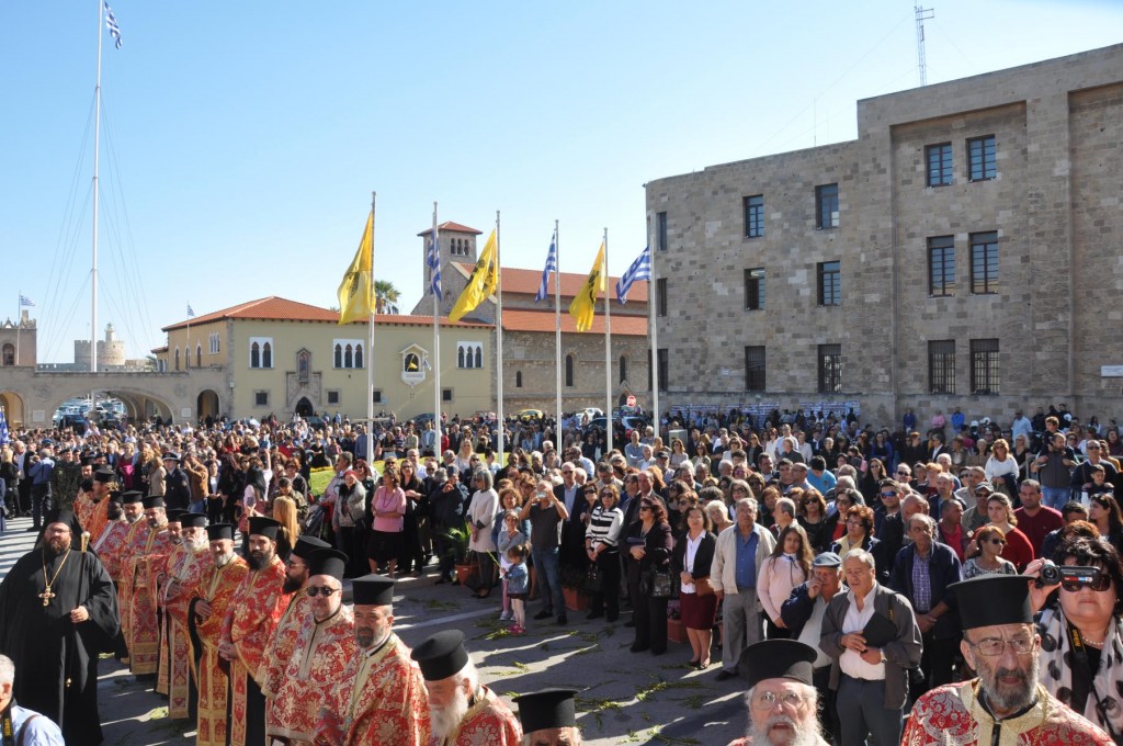 Την κυριώνυμη ημέρα της Εορτής, προ της Απολύσεως της Θείας Λειτουργίας ακολούθησε η λιτάνευση της ιεράς Εικόνος και του τιμίου Λειψάνου του Αγίου στο κέντρο της πόλεως συνοδεία αγήματος του στρατού και της φιλαρμονικής του Δήμου Ρόδου. Η πομπή κατέληξε στα προπύλαια του Δημοτικού Μεγάρου, όπου έλαβε χώρα η ευλόγηση των άρτων και ακολούθως η απόλυσις παρουσία του κλήρου της Ιεράς Μητροπόλεως, των πολιτικών και στρατιωτικών Αρχών του τόπου μας, της μαθητικής και εκπαιδευτικής κοινότητας και πλήθους κόσμου. Ο Σεβασμιώτατος Μητροπολίτης μας στην προσφώνηση του παρουσίασε τους αγίους Αρχιερείς και εξέφρασε τις δέουσες για την περίσταση ευχαριστίες.