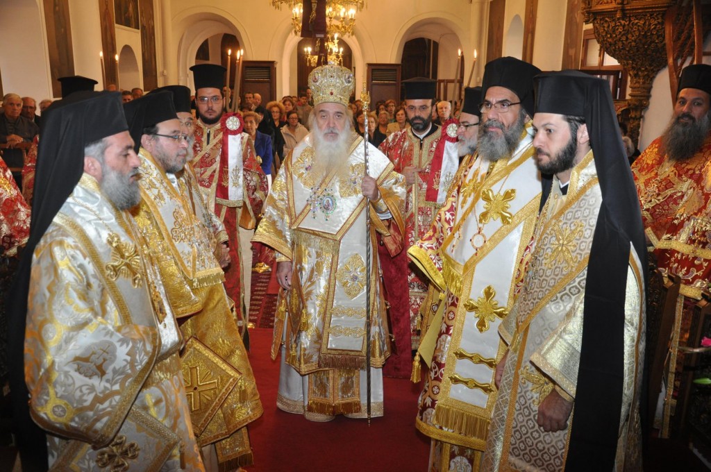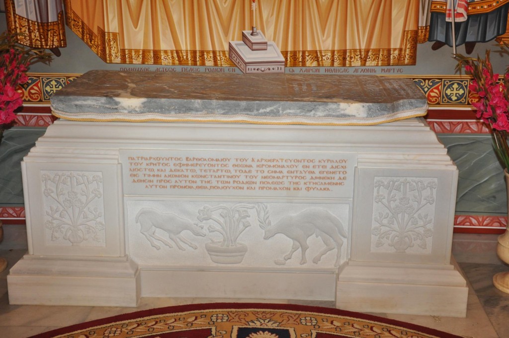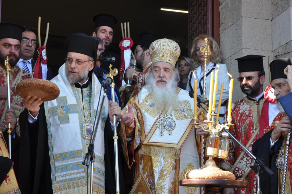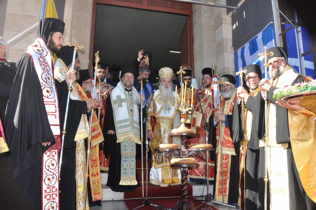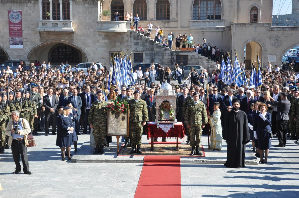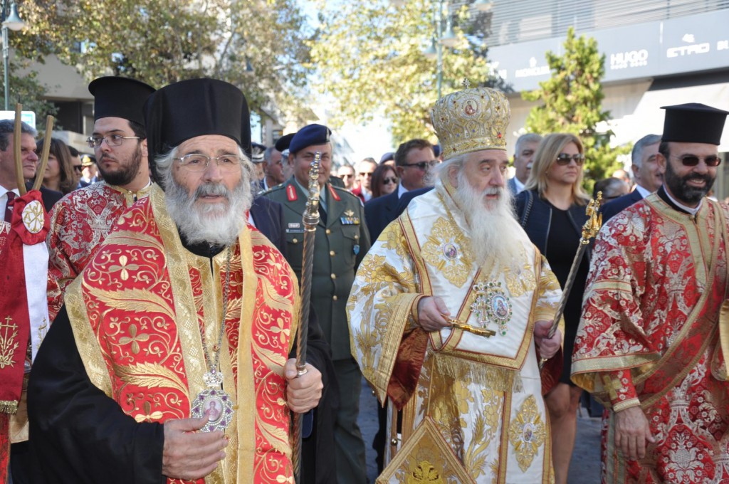 Την κυριώνυμη ημέρα της Εορτής, προ της Απολύσεως της Θείας Λειτουργίας ακολούθησε η λιτάνευση της ιεράς Εικόνος και του τιμίου Λειψάνου του Αγίου στο κέντρο της πόλεως συνοδεία αγήματος του στρατού και της φιλαρμονικής του Δήμου Ρόδου. Η πομπή κατέληξε στα προπύλαια του Δημοτικού Μεγάρου, όπου έλαβε χώρα η ευλόγηση των άρτων και ακολούθως η απόλυσις παρουσία του κλήρου της Ιεράς Μητροπόλεως, των πολιτικών και στρατιωτικών Αρχών του τόπου μας, της μαθητικής και εκπαιδευτικής κοινότητας και πλήθους κόσμου. Ο Σεβασμιώτατος Μητροπολίτης μας στην προσφώνηση του παρουσίασε τους αγίους Αρχιερείς και εξέφρασε τις δέουσες για την περίσταση ευχαριστίες.