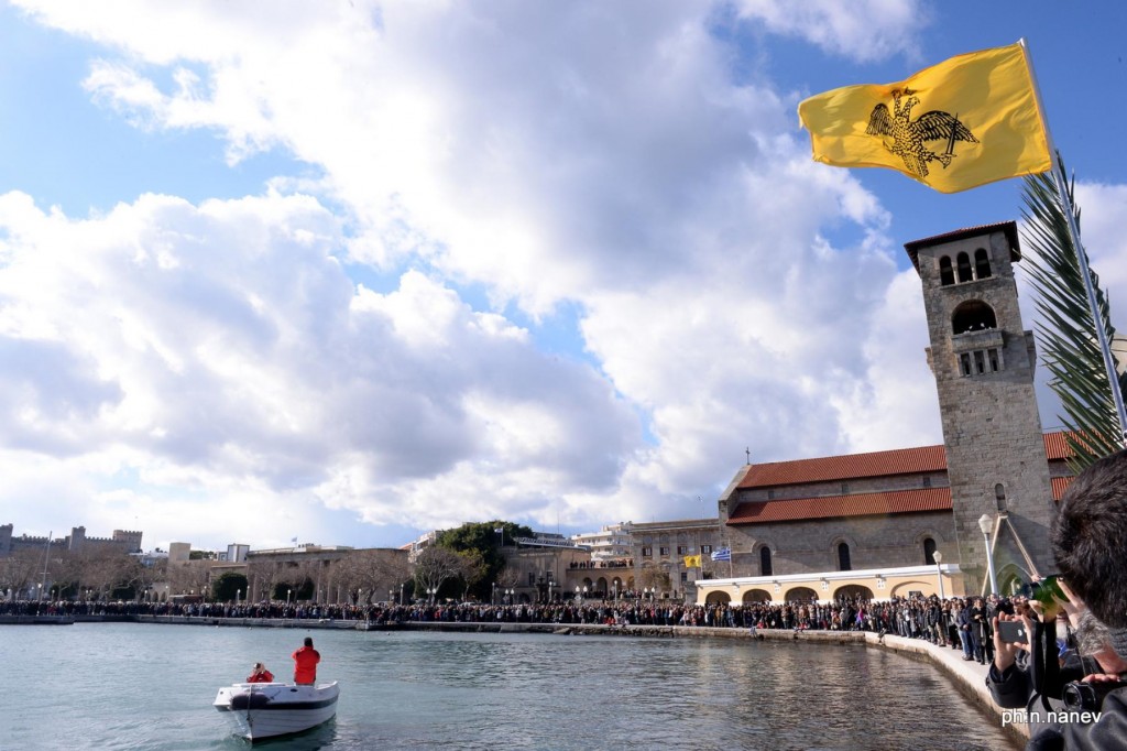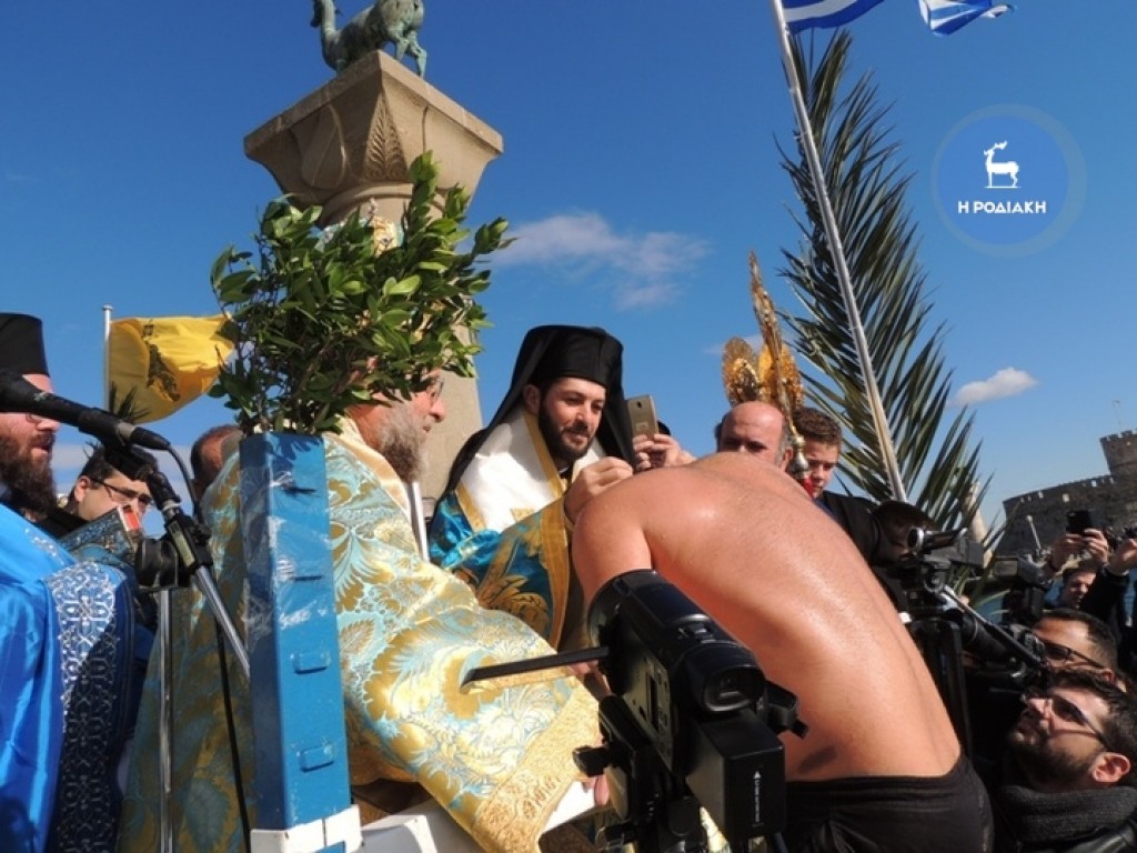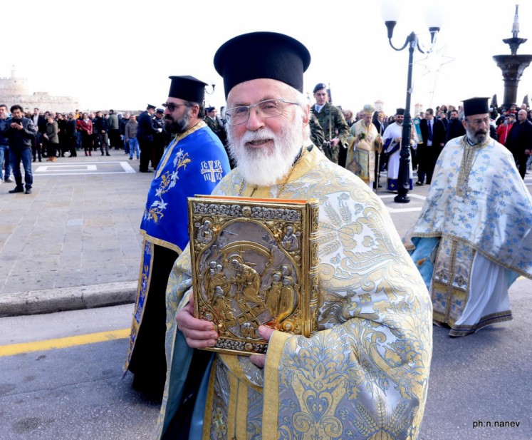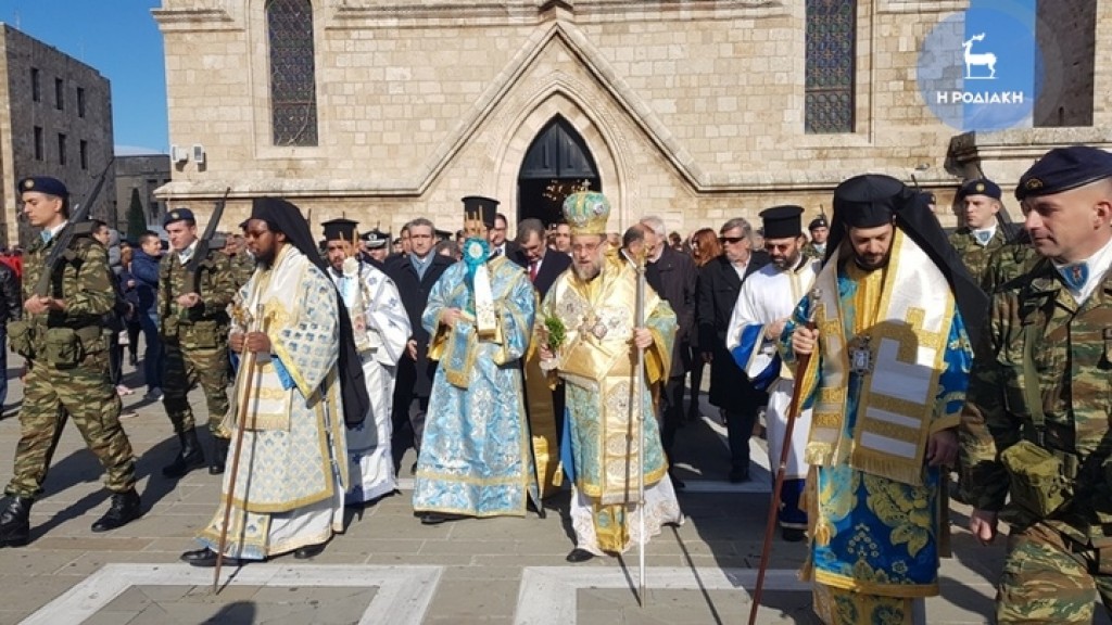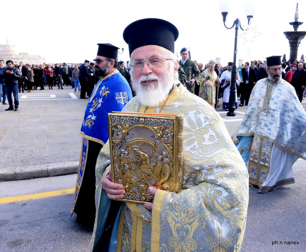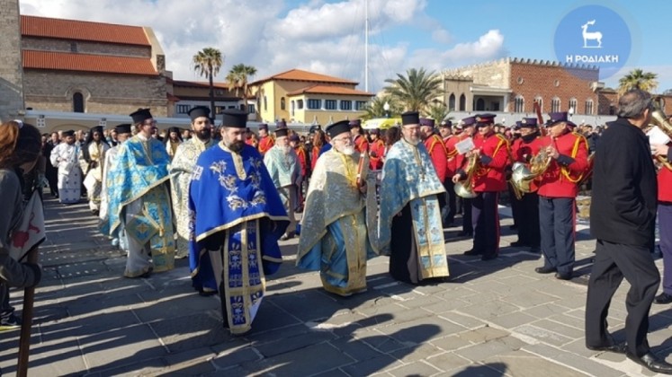 Την κυριώνυμη ημέρα της εορτής (6-1-2019) ο Σεβασμιώτατος προέστη της Αρχιερατικής Συλλειτουργίας (συλλειτουργούντων των Θεοφιλεστάτων Επισκόπων Γκούλου και Ανατολικής Ουγκάντας κ. Σιλβέστρου και Ολύμπου κ. Κυρίλλου) και της Ακολουθίας του Μεγάλου Αγιασμού των Θεοφανείων στον Καθεδρικό Ιερό Ναό του Ευαγγελισμού της Θεοτόκου και αμέσως μετά με τους Θεοφιλεστάτους αγίους Αρχιερείς, ιερό Κλήρο, τους εκπροσώπους των Αρχών μετέβη στον καθορισμένο τόπο, στο λιμάνι του Μανδρακίου, όπου έλαβε χώρα η τελετή της καταδύσεως του Τιμίου Σταυρού και του Αγιασμού των υδάτων. Αρκετοί ήταν οι τολμηροί που και φέτος έπεσαν στα παγωμένα νερά προκειμένου να ανασύρουν τον Τίμιο Σταυρό. Τον Σταυρό ανέσυρε από τα παγωμένα νερά o κ. Ευάγγελος Καριοφυλλάκης, στον οποίο ο Σεβασμιώτατος επέδωσε, κατά το έθος, χρυσό Σταυρό. Στη σύντομη προσλαλιά του αναφέρθηκε στο μήνυμα της Εορτής και ευχήθηκε τα δέοντα. Στη συνέχεια μετέβη στις εγκαταστάσεις του Ναυτικού Ομίλου Ρόδου για την καθιερωμένη ευλογία της Βασιλόπιτας του Ομίλου