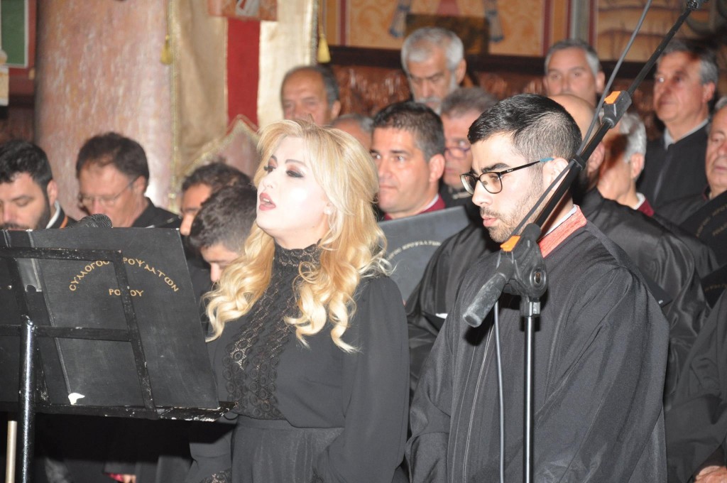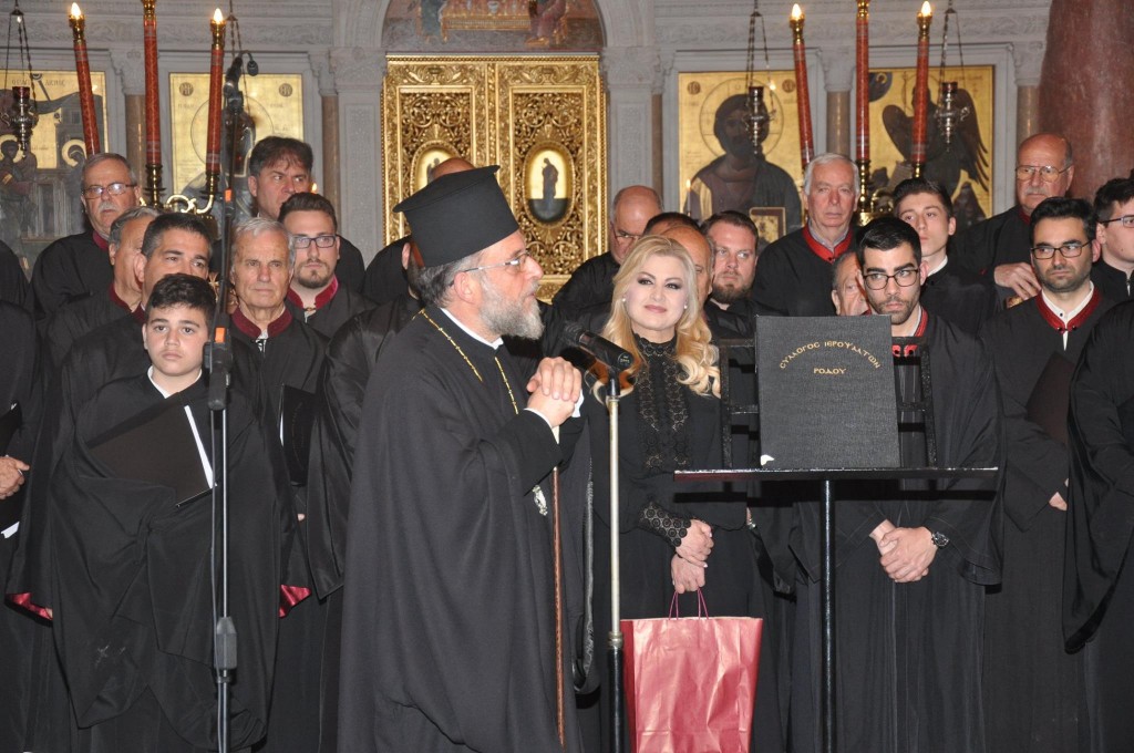 Mε μεγάλη επιτυχία και σε κλίμα κατάνυξης πραγματοποιήθηκε και φέτος η Μουσική Εκδήλωση για τη Μεγάλη Εβδομάδα, την Τετάρτη 17 Απριλίου 2019, την οποία διοργανώνει κάθε χρόνο η Χορωδία του Συλλόγου Ιεροψαλτών Ρόδου "Ευάγγελος Μουτάφης" υπό την αιγίδα της Ιεράς Μητροπόλεως μας. Η εκδήλωση περιελάμβανε Ύμνους της Μεγάλης Εβδομάδας, τους οποίους με καλλιέπεια απέδωσε ο Χορός του Συλλόγου υπό την διεύθυνση του Πρωτοψάλτου του Μητροπολιτικού ιερού μας Ναού κ. Παναγιώτη Μανουσάκη, ενώ η κ. Χριστίνα Κόζα απέδωσε τα λεγόμενα "Μοιρολόγια της Παναγίας", ὀπως ψάλλονται τη Μεγάλη Παρασκευή στα χωριά Αρχάγγελος, Απολακιά και Αρχίπολη. Την εκδήλωση, στην οποία παρέστησαν ο Σεβασμιώτατος, ο Θεοφιλέστατος Επίσκοπος Ολύμπου, Εκπρόσωποι των Τοπικών Αρχών, πολλοί Ιερείς μας και δεκάδες Χριστιανών μας, προλόγισε και παρουσίασε ο Ηγούμενος της Ιεράς Μονής Ταξιάρχου Θαρρίου και Ιεροκήρυξ Αρχιμ. Νεκτάριος Πόκιας.