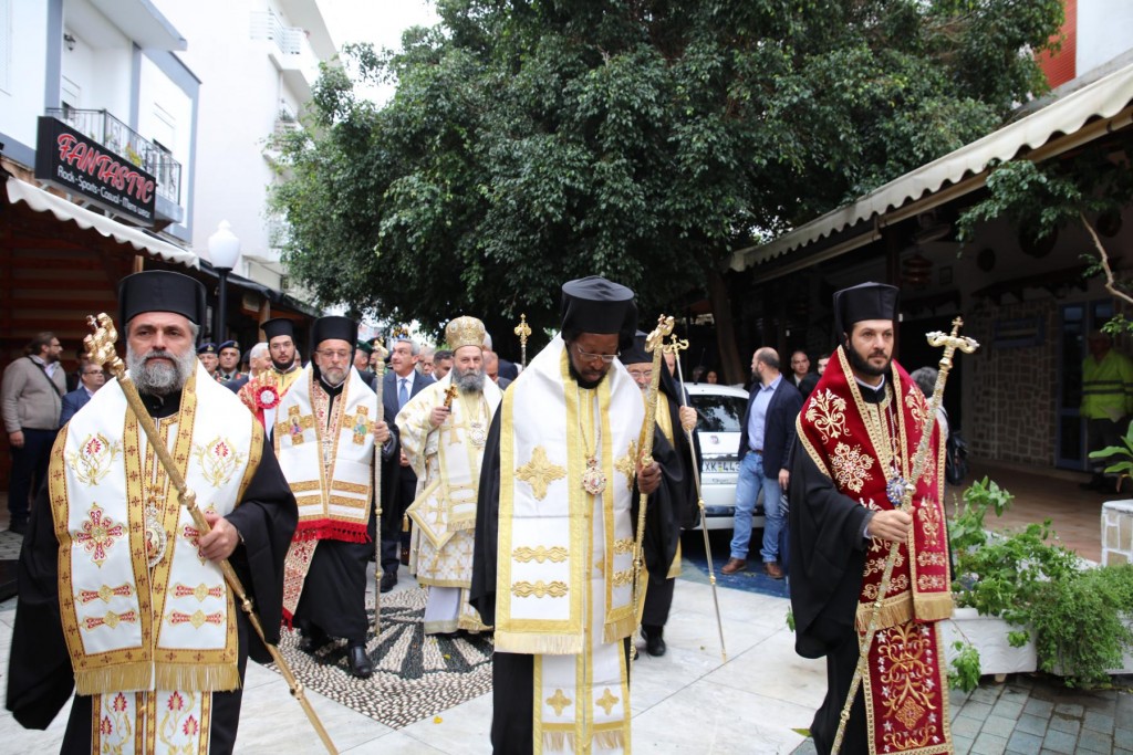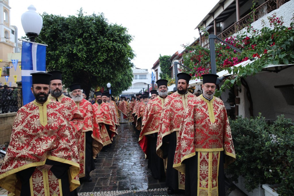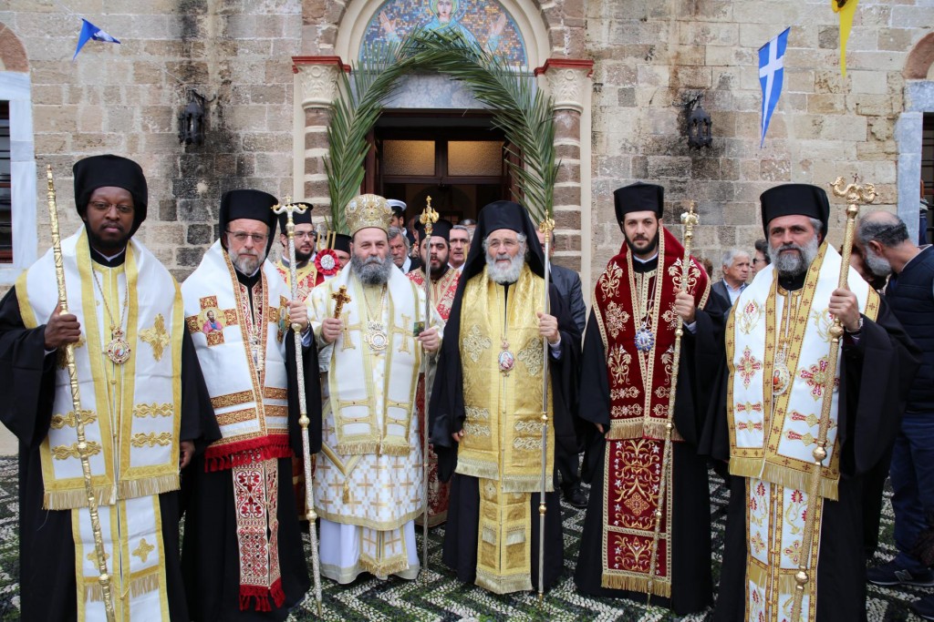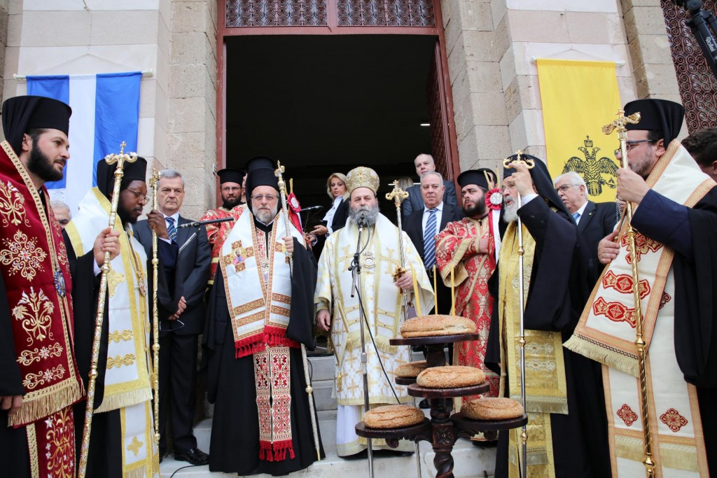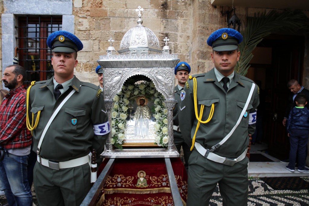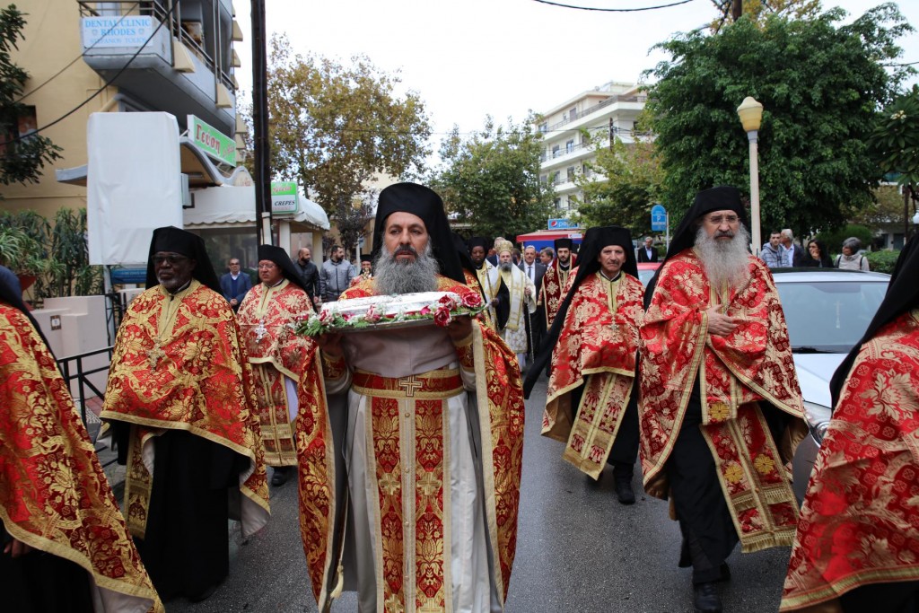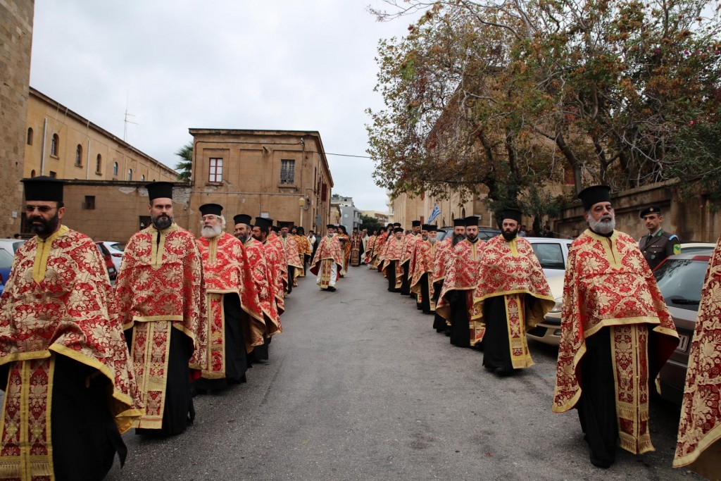 Την κυριώνυμη ημέρα της Εορτής, του Όρθρου χοροστάτησε ο Σεβασμιώτατος άγιος Λέρου, ενώ της Θ. Λειτουργίας και της Λιτανείας της Εικόνας και του τιμίου Λειψάνου του Αγίου, καθώς και της Εικόνας της Υπεραγίας Θεοτόκου της «Σκιαδενής» προέστη ο Σεβασμιώτατος άγιος Ιωαννίνων κ. Μάξιμος συλλειτουργούντων των ως άνω Αρχιερέων. Τον θείο λόγο κήρυξε ο Σεβασμιώτατος Μητροπολίτης μας. Η λιτανευτική πομπή, συνοδεία στρατιωτικού αγήματος και της φιλαρμονικής της 95 ΑΔΤΕ, κατέληξε στα προπύλαια του Δημοτικού Μεγάρου, όπου έλαβε χώρα η ευλόγηση των Άρτων και ακολούθως η Απόλυσις, παρουσία του κλήρου της Ιεράς Μητροπόλεως, των πολιτικών και στρατιωτικών Αρχών του τόπου μας, της μαθητικής και εκπαιδευτικής κοινότητας και πλήθους κόσμου. Ο Σεβασμιώτατος Μητροπολίτης μας στην προσφώνηση του παρουσίασε τους αγίους Αρχιερείς και εξέφρασε τις δέουσες για την περίσταση ευχαριστίες. Τους ύμνους κατά τον Εσπερινό, τον Όρθρο και την Θεία Λειτουργία απέδωσε η χορωδία του Συλλόγου Ιεροψαλτών Ρόδου.