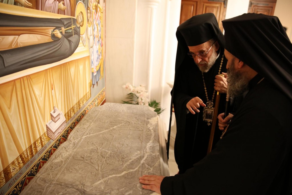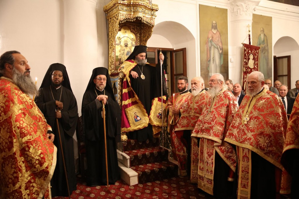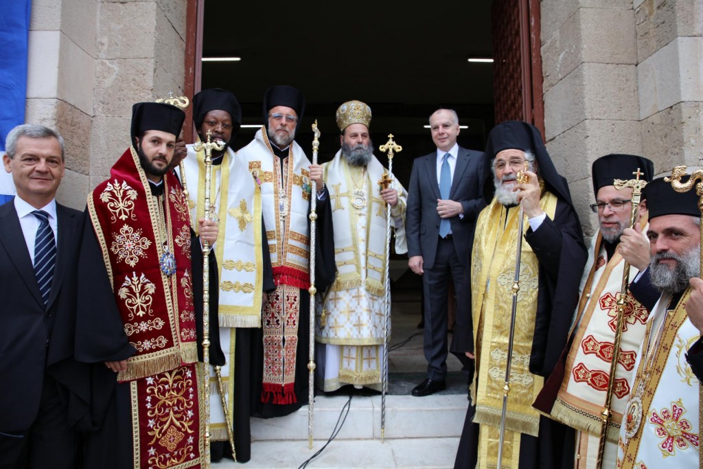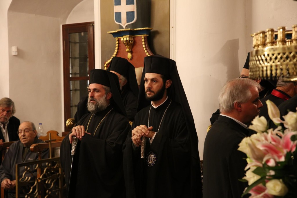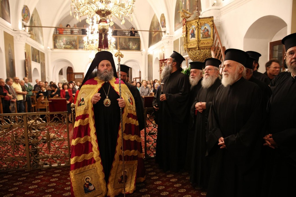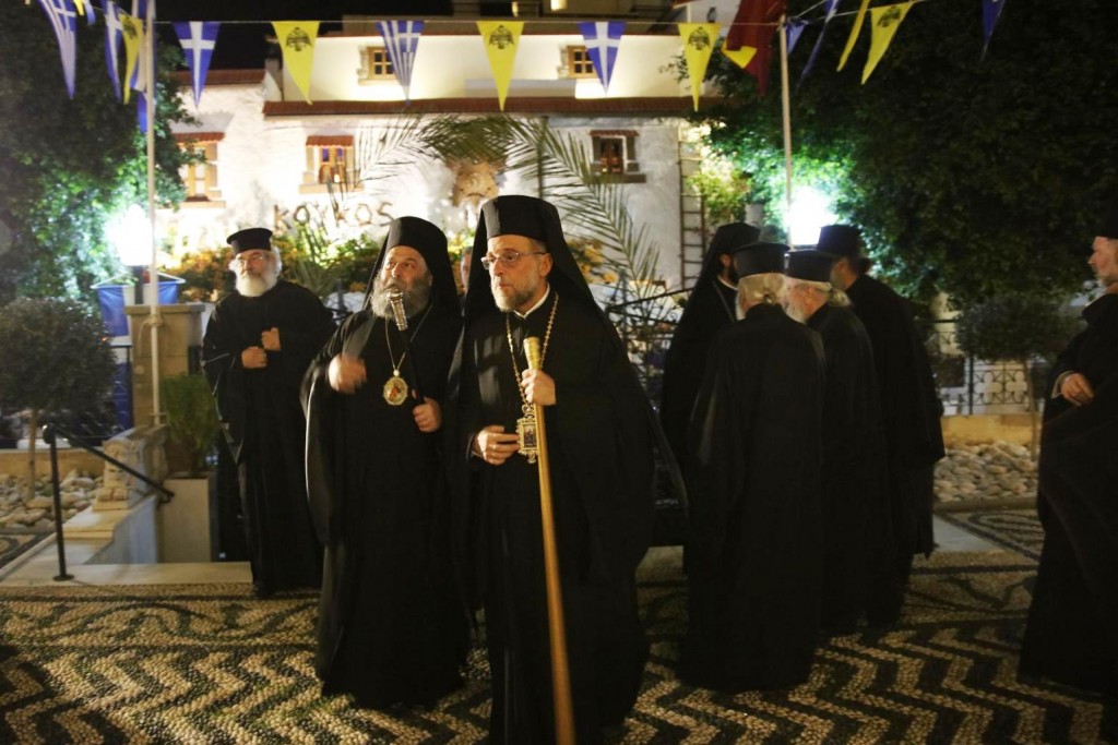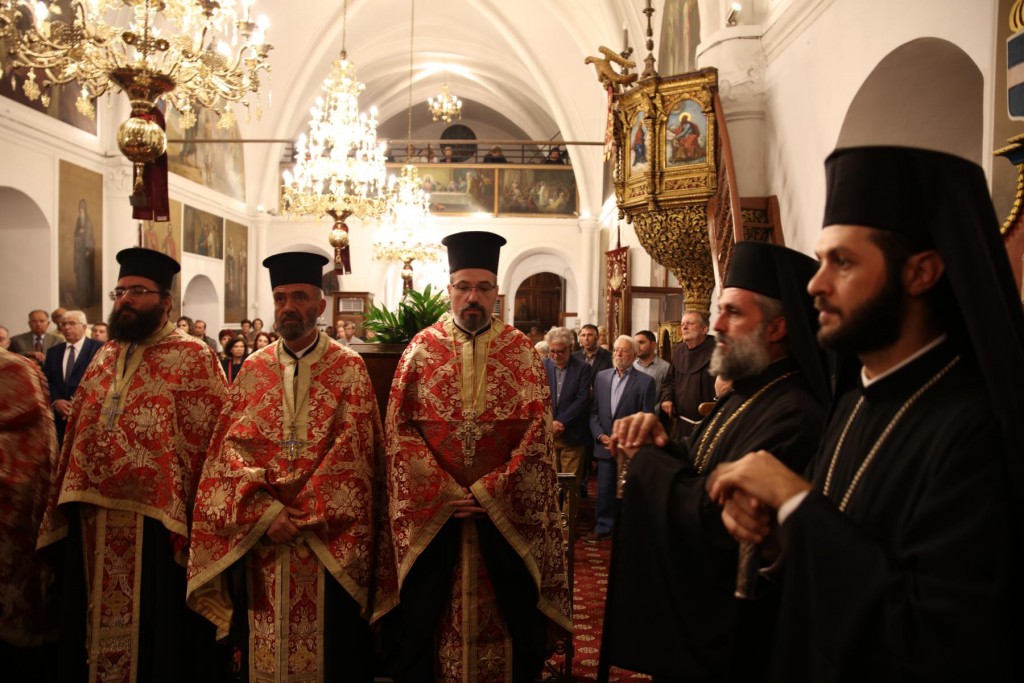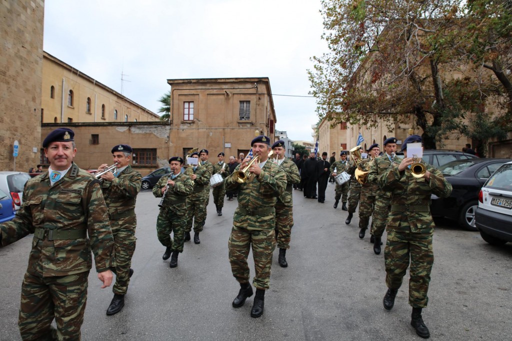 Την κυριώνυμη ημέρα της Εορτής, του Όρθρου χοροστάτησε ο Σεβασμιώτατος άγιος Λέρου, ενώ της Θ. Λειτουργίας και της Λιτανείας της Εικόνας και του τιμίου Λειψάνου του Αγίου, καθώς και της Εικόνας της Υπεραγίας Θεοτόκου της «Σκιαδενής» προέστη ο Σεβασμιώτατος άγιος Ιωαννίνων κ. Μάξιμος συλλειτουργούντων των ως άνω Αρχιερέων. Τον θείο λόγο κήρυξε ο Σεβασμιώτατος Μητροπολίτης μας. Η λιτανευτική πομπή, συνοδεία στρατιωτικού αγήματος και της φιλαρμονικής της 95 ΑΔΤΕ, κατέληξε στα προπύλαια του Δημοτικού Μεγάρου, όπου έλαβε χώρα η ευλόγηση των Άρτων και ακολούθως η Απόλυσις, παρουσία του κλήρου της Ιεράς Μητροπόλεως, των πολιτικών και στρατιωτικών Αρχών του τόπου μας, της μαθητικής και εκπαιδευτικής κοινότητας και πλήθους κόσμου. Ο Σεβασμιώτατος Μητροπολίτης μας στην προσφώνηση του παρουσίασε τους αγίους Αρχιερείς και εξέφρασε τις δέουσες για την περίσταση ευχαριστίες. Τους ύμνους κατά τον Εσπερινό, τον Όρθρο και την Θεία Λειτουργία απέδωσε η χορωδία του Συλλόγου Ιεροψαλτών Ρόδου.