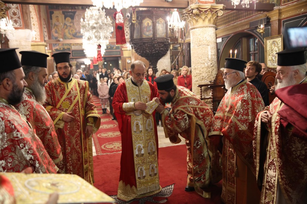 Μετά την ανάγνωση του ιερού Ευαγγελίου διαβάστηκε η "Πατριαρχική απόδειξις επί τη Εορτή των Χριστουγέννων" και εψάλη το Πολυχρόνιο της Αυτού Θειοτάτης Παναγιότητος, του Οικουμενικού Πατριάρχου κ. κ. ΒΑΡΘΟΛΟΜΑΙΟΥ.