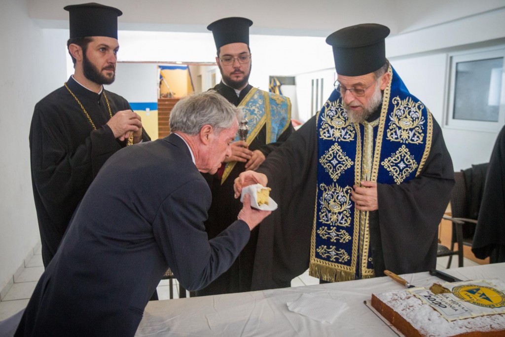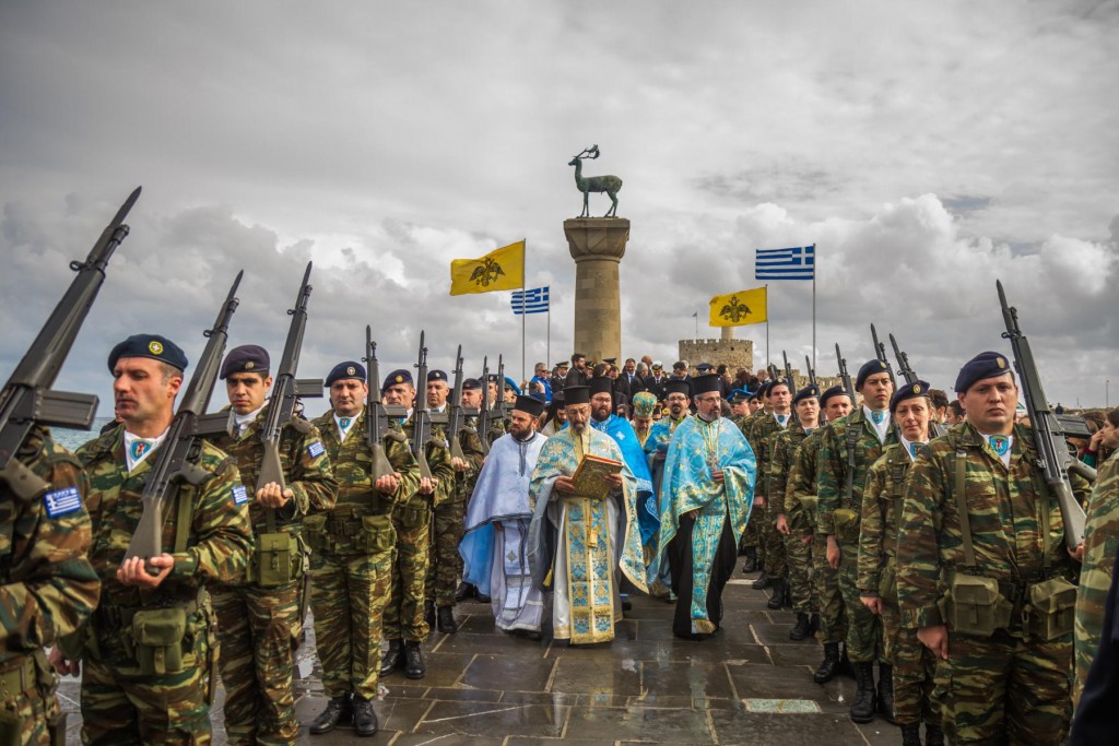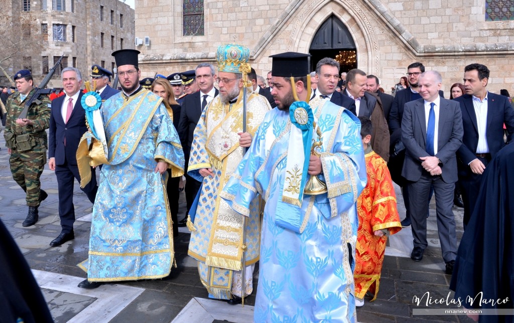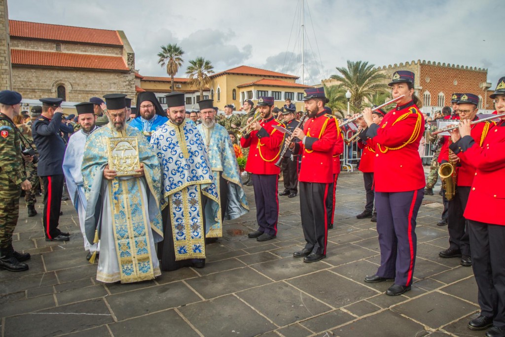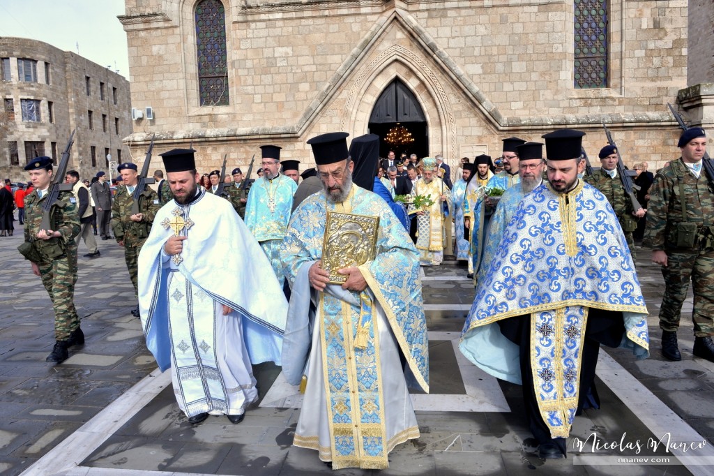 Την κυριώνυμη ημέρα της εορτής (Δευτέρα 6 Ιανουαρίου 2020) ο Σεβασμιώτατος χοροστάτησε του Όρθρου, τέλεσε την Θεία Λειτουργία, (συλλειτουργούντος του Θεοφιλεστάτου αγίου Ολύμπου) και την Ακολουθία του Μεγάλου Αγιασμού των Θεοφανείων στον Καθεδρικό Ιερό Ναό του Ευαγγελισμού της Θεοτόκου και αμέσως μετά με τον ιερό Κλήρο και τις Αρχές του τόπου μετέβη στον καθορισμένο τόπο, στό λιμάνι του Μανδρακίου, όπου έλαβε χώρα η τελετή της καταδύσεως του Τιμίου Σταυρού και του Αγιασμού των υδάτων. Τον Σταυρό ανέσυραν από τα παγωμένα νερά oι Καριοφυλάκης Ευάγγελος και Ζαρίφης Γεώργιος. Στη σύντομη προσλαλιά του αναφέρθηκε στο μήνυμα της Εορτής και ευχήθηκε τα δέοντα. Στη συνέχεια μετέβη στις εγκαταστάσεις του Ναυτικού Ομίλου Ρόδου και ακολούθως στους χώρους της Φιλαρμονικής του Δήμου Ρόδου για την καθιερωμένη ευλογία της Βασιλόπιτας τους.