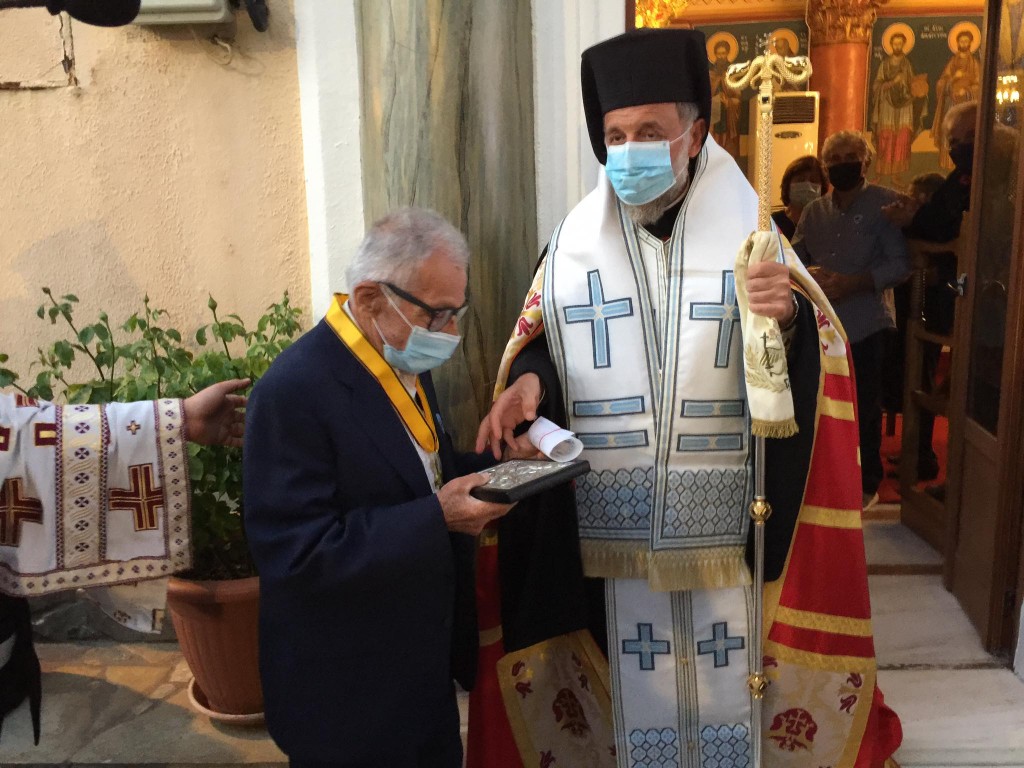 Του πανηγυρικού Εσπερινού (Πέμπτη 13 Μαΐου 2021) χοροστάτησε ο Σεβασμιώτατος Μητροπολίτης μας, ο οποίος προ της Απολύσεως απέδωσε τον Χρυσό Σταυρό των Μητροπόλεων του Οικουμενικού Πατριαρχείου στη Δωδεκάνησο (ανώτατη τιμητική διάκριση) στον κ. Ανδρόνικο Παπαθανασίου, Συναταξιούχο Θεολόγο Εκπαιδευτικό, εκφράζοντας τον έπαινο και την τιμή της τοπικής Εκκλησίας για την προσφορά του ως Θεολόγου, Ιεροψάλτη και, για πολλά χρόνια, Μέλους του Εκκλησιαστικού Συμβουλίου της γενέτειράς του, του χωριού του Αγίου Ισιδώρου.
